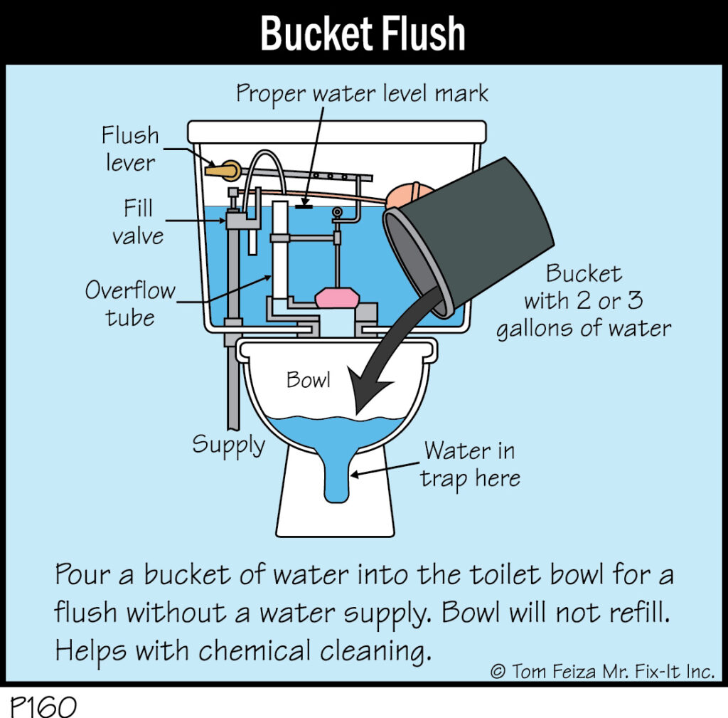 The bucket flush is also a very effective way to remove water from the toilet bowl. Say you need to remove hard water stains from the bowl, and you want to use the cleaning chemical directly on the stain without diluting it with water. Use the “bucket” flush to remove the water from the bowl, and then apply your cleaning chemical.