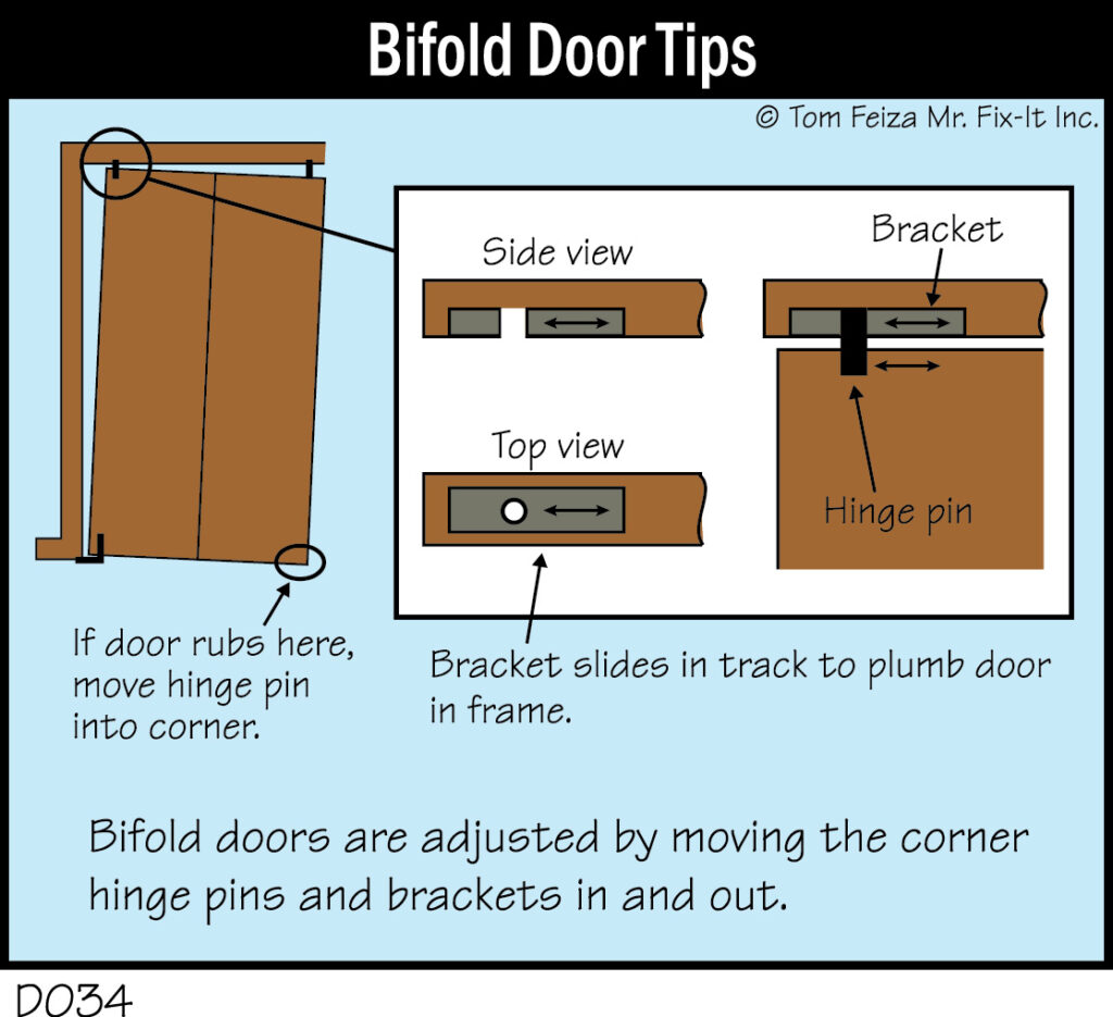 A bifold door is one that is hinged in the middle and folds to open and close. In most cases, a simple adjustment will correct a sticking bifold door. Sometimes the bracket is just loose and needs to be moved and tightened. Take a look at the illustration.