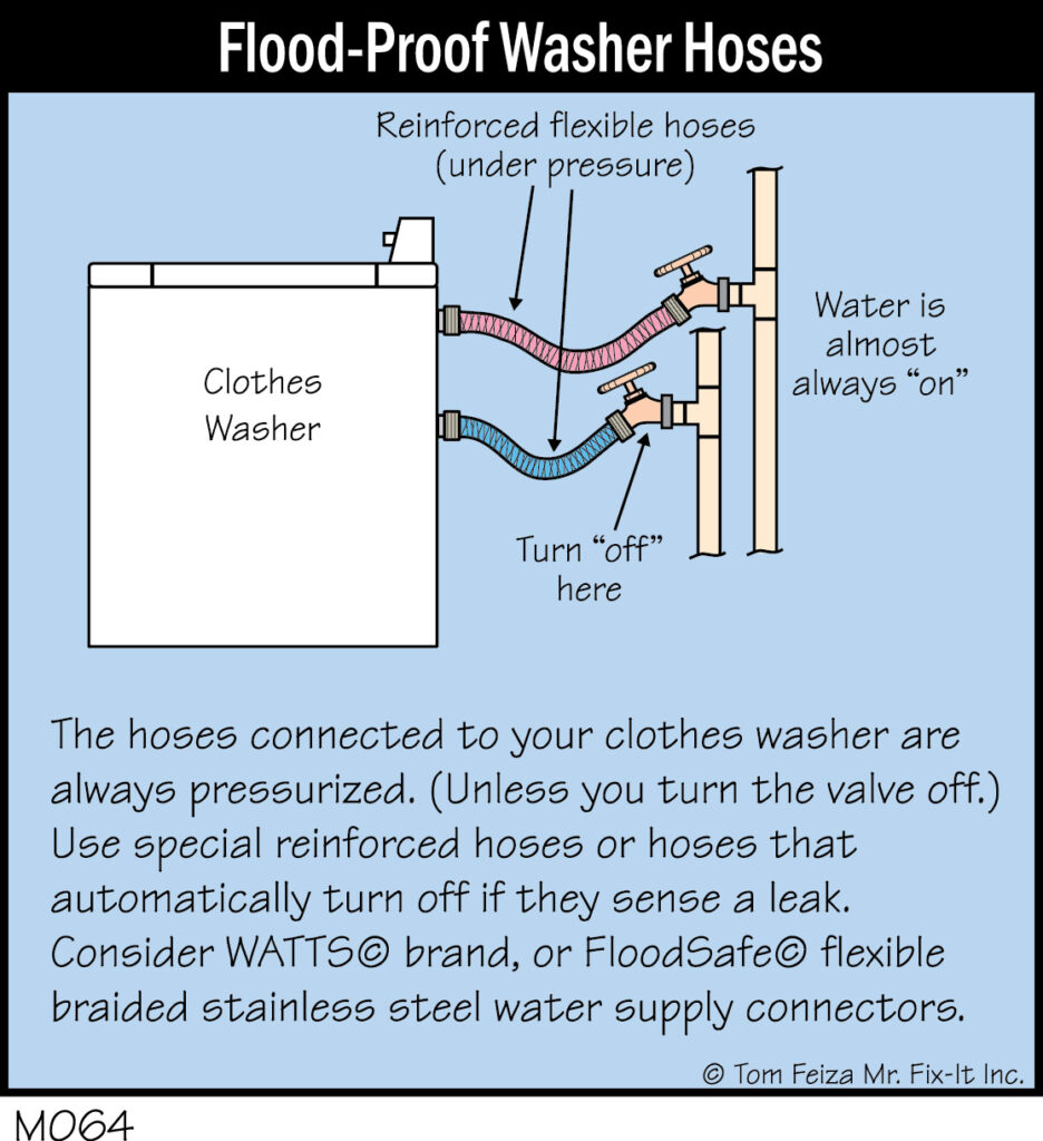 Make sure your washer has heavy, reinforced hoses. The better quality washer hoses are reinforced with braided metal on the outside or inside. In this case, cost can be an indication of quality, so buy the best hoses you can find and read labels to compare types of construction.