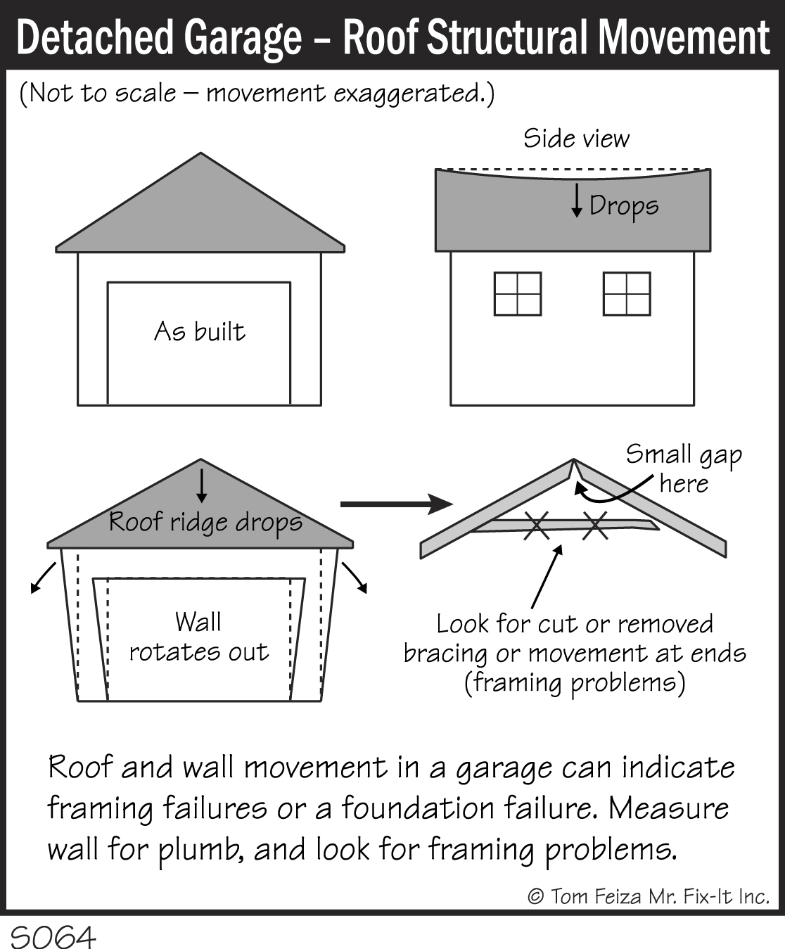In most cases, just ignore the movement if it’s small– say, a 1-inch tip per 6 feet vertical. But if movement interferes with the garage door operation or other doors or windows, you may want to consult a carpenter. If movement is ongoing, you definitely must address it.