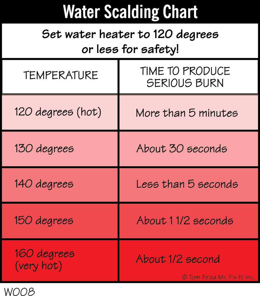 The accompanying chart shows how fast excessively hot water can burn. Residential water heaters should always be set to a temperature not to exceed 120 degrees F. Measure the water temperature with a thermometer at a faucet after establishing the flow of hot water.