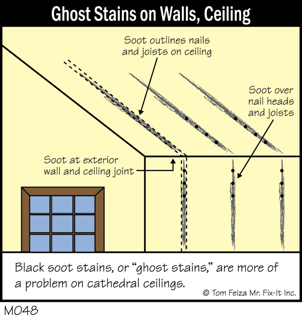 Often there is no insulation at the edges of studs on outside walls or ceilings. Instead, insulation is placed between the studs. As air slows around the cooler drywall at the uninsulated stud edge, soot gets deposited in a ghostly outline. The nails are also cooler than their surroundings, so you may see soot spots at the drywall nails or screw heads.