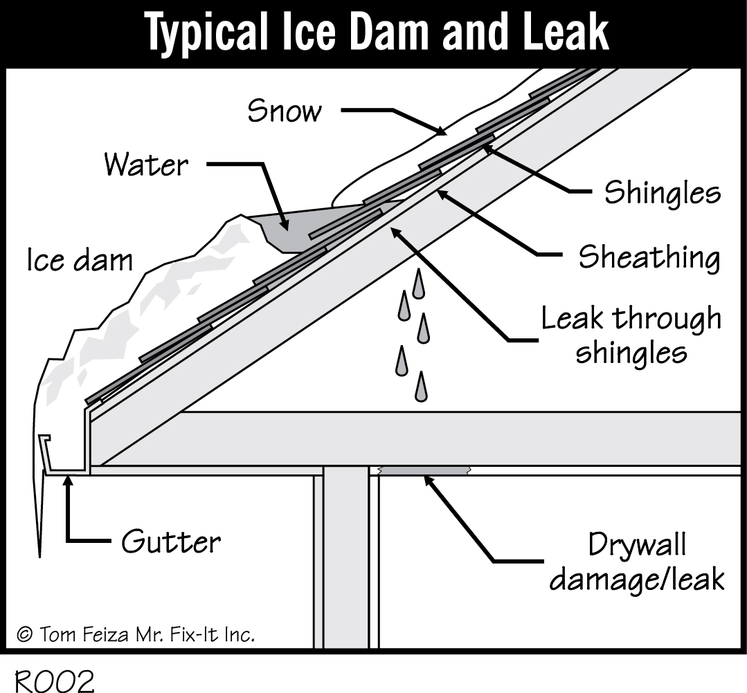 Ice dams occur when snow melts on a warm roof, slides to the cold edge of the roof, and re-freezes as ice in the gutter and overhang. (See figure 13 and 5.) This ice buildup creates a “dam” that blocks water on the roof. The water then leaks through the standard asphalt shingle assembly that is not designed to resist ponding water.