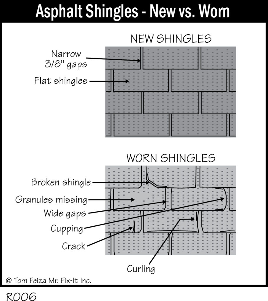 When a roof ages, you will see the shingles shrinking and vertical gaps between the shingle tabs opening up on the typical three-tab shingle. On a new roof, the gap will be about 3/8 inch wide and the edges of the shingle will be square, smooth, and flat. On an older roof, the gap will open from 3/8 inch to ¾ inch or even 1 inch, and the edges will curl and lift. Older roofs will also lose their granular coating, crack, cup, split, and thicken at the edges.