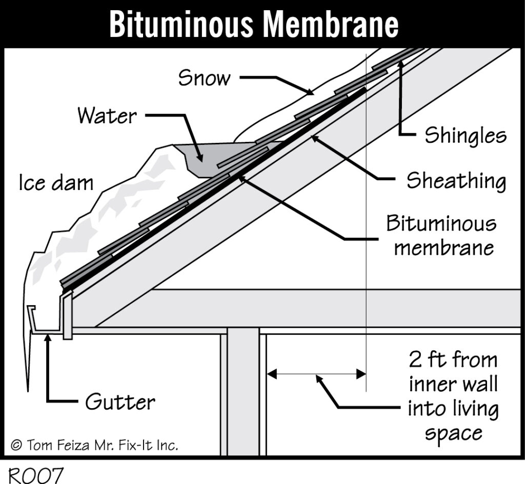 In northern climates, a bituminous membrane should be used on all roof replacements. The bituminous membrane is laid on the roof deck, under the shingles. The membrane seals around the nails as the singles are applied. This membrane protects against ice dams by directing water to the edge of the roof even if the water has penetrated the asphalt shingles.