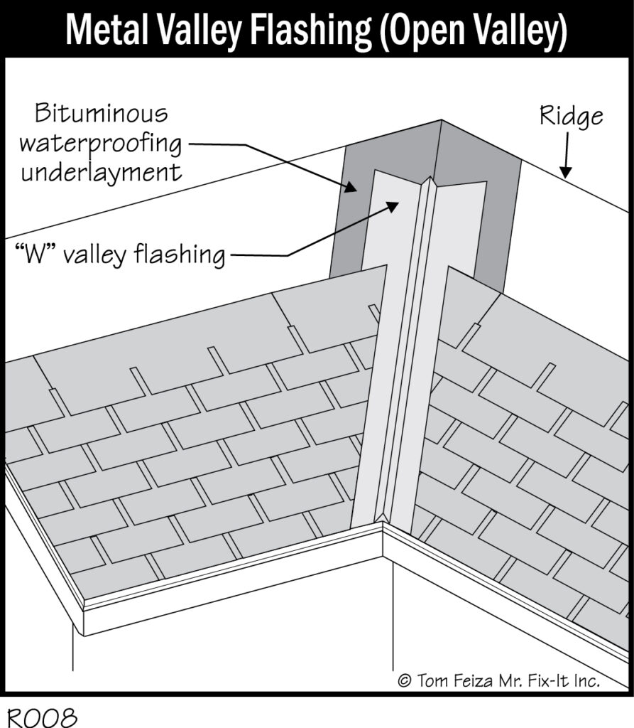 Valley flashings can be installed with any of three methods, and all will work well. In northern climates, an open valley with a metal flashing is the most common. The metal extends up and under the shingles to form a joint between the planes of the roof. The metal carries the water to the edge of the roof.