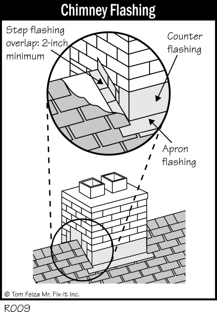 Chimneys present a special problem because they penetrate the roof and expand and move independently of the structure of the home. At the joint of the masonry chimney to the roof, there should be step flashing covered by cap flashing. The cap flashing should be cut into the masonry joints of the chimney.
