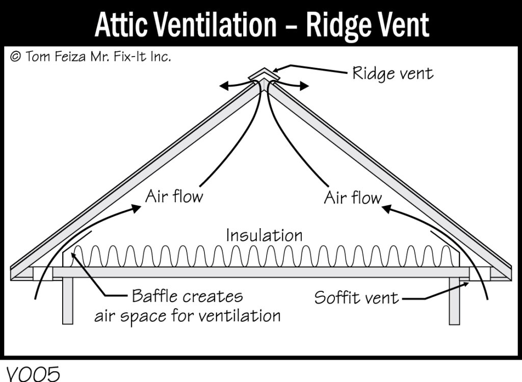 Today, ridge vents are often utilized as a replacement for the standard roof vent that looks like a large metal mushroom near the top of the roof. A ridge vent runs along the peak or ridge of the roof. Most ridge vents are now covered with shingles to match the roof. From the ground, you will see a section along the ridge raised about 1 inch.