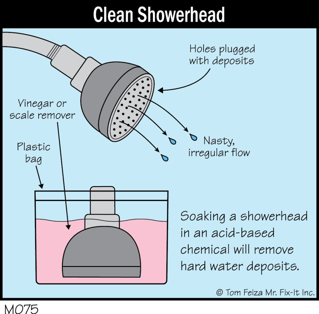 Solve the problem by soaking the shower head in a plastic storage bag filled with vinegar or a hard-water-scale removal product. Often you can just fill the bag and tie it around the pipe that feeds the shower head. Follow label directions for any chemical you use.