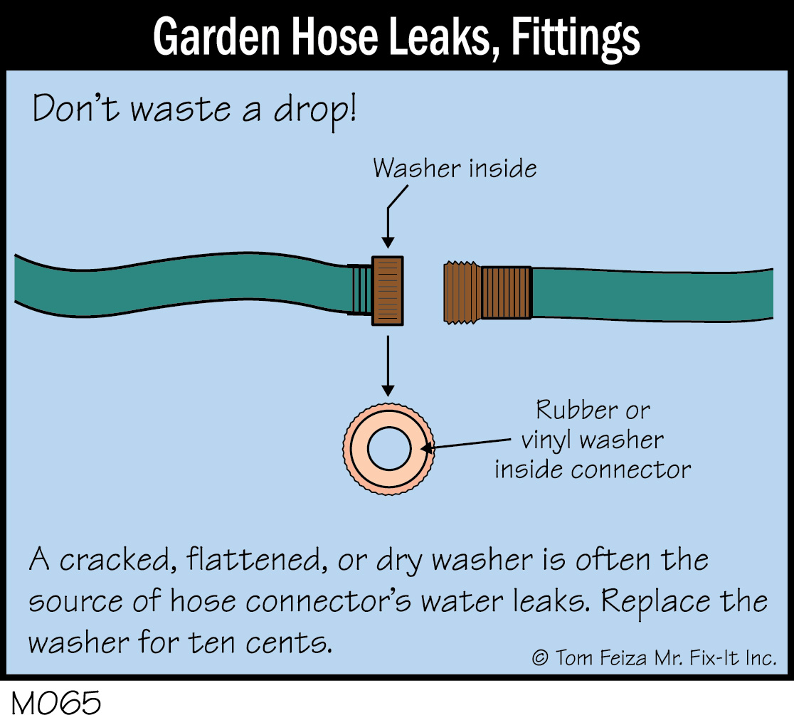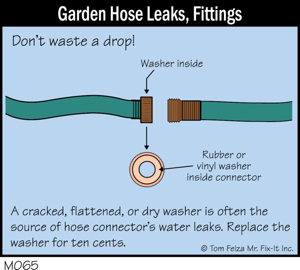 A quick trip to the hardware store and just a few dollars can make your hoses perform like new. If the leak is at a fitting and the connectors are in good shape, just replace the washer in the fitting. A hard, cracked or grooved washer will always leak no matter how much you tighten the fitting. The new washer will seal between the two mating surfaces and make the connection watertight.