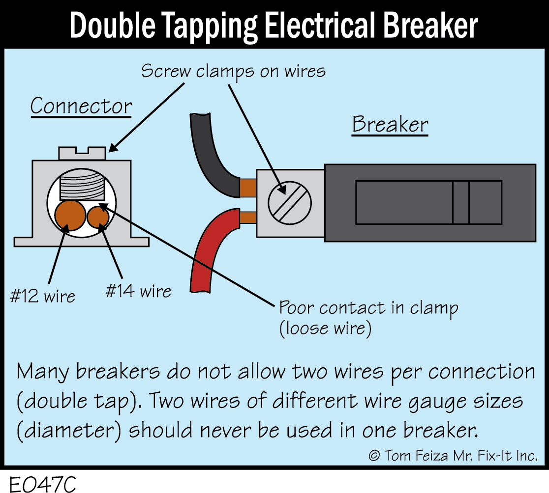 Take a look at the illustration of an electrical circuit breaker connected to two wires – a double tap. This is a problem, because the clamp is designed to squeeze down on one wire to make a secure connection. Here we have wires of different diameters (different amperage ratings), and the smaller wire is loose.