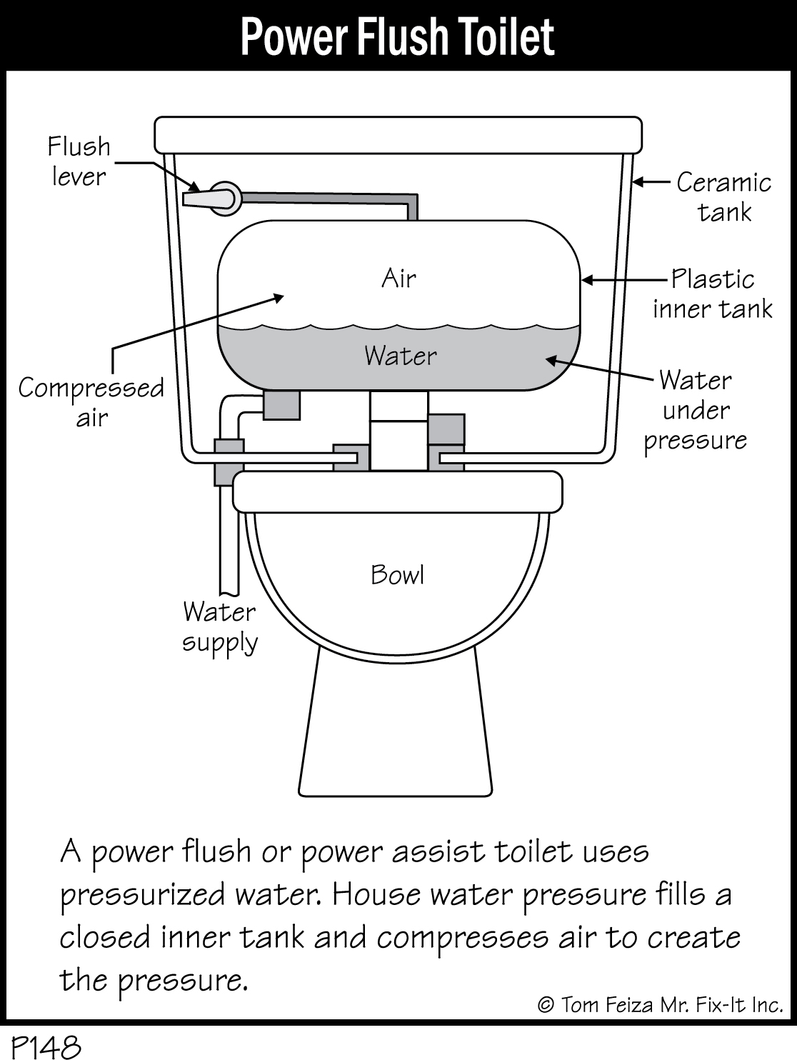 Recently, designers have greatly improved the standard flush toilet by raising the height of water in the tank, enlarging the flush valve, reducing the quantity of water in the trap and enlarging the diameter of the trap. These improvements make the 1.6-gallon flush toilets perform well without the aid of a pressurized tank.